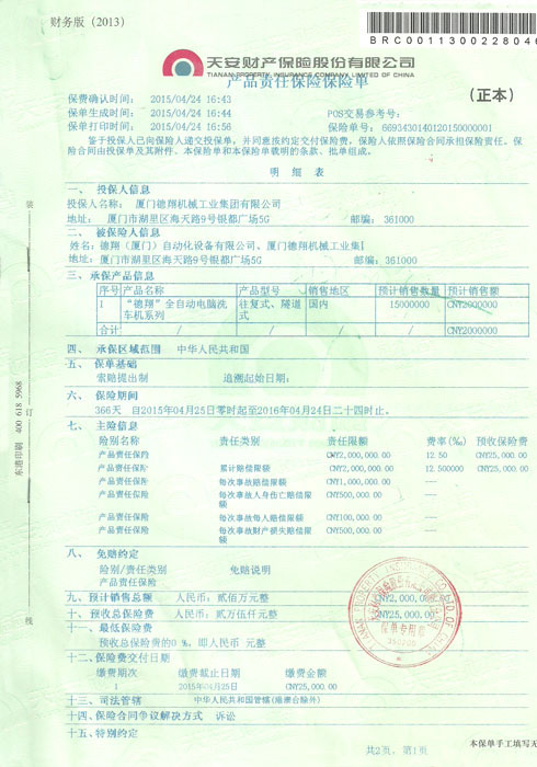 裝備承制單位注冊(cè)證書-天安保險(xiǎn)單